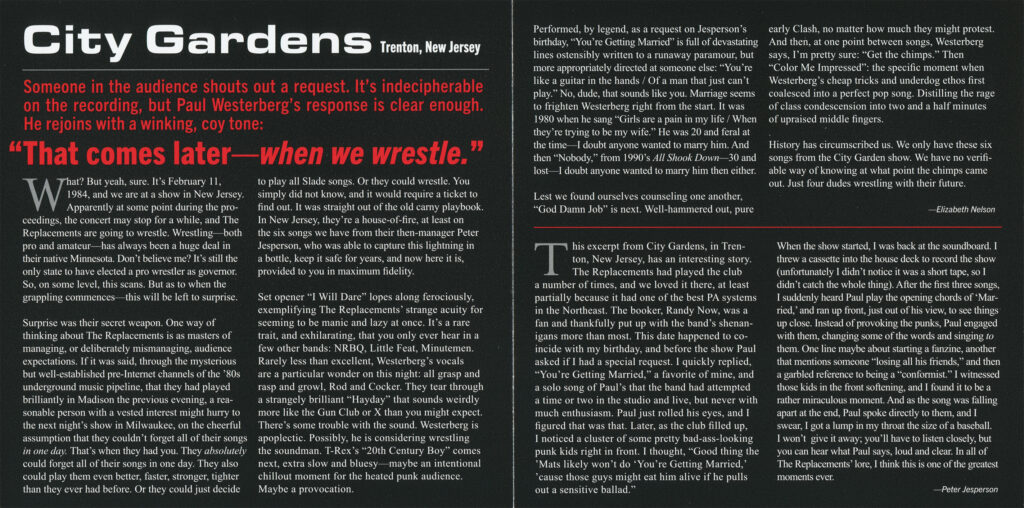 La interpretación de “You’re Getting Married” es particularmente destacable; Paul Westerberg modificó la letra a mitad del concierto para el cumpleaños de Jesperson, interpretando la emotiva balada ante un público punk que, según se cuenta, temía que los “devoraran vivos”. Jesperson la calificó posteriormente como “uno de los mejores momentos” en la historia de la banda.