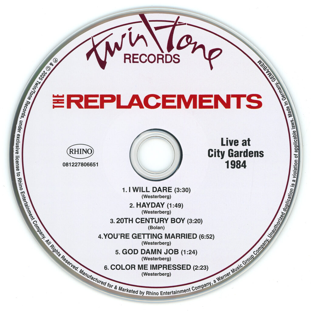 La presentación ofrece un repertorio crudo que destaca los primeros temas de los Replacements: I Will Dare (3:30), Hayday (1:49), 20th Century Boy (versión de T. Rex) (3:20), You’re Getting Married (6:53), God Damn Job (1:25) y Color Me Impressed (2:23).